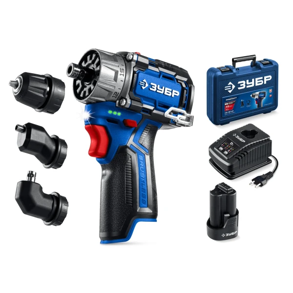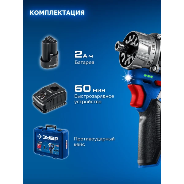 ЗУБР КОМБИ #2, 12 В, 45 Н·м, 1 АКБ тип Т7 (2 А·ч), модульная дрель-шуруповерт, BRUSHLESS, кейс, Профессионал (DB-125-21)
