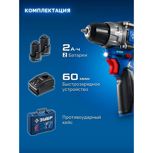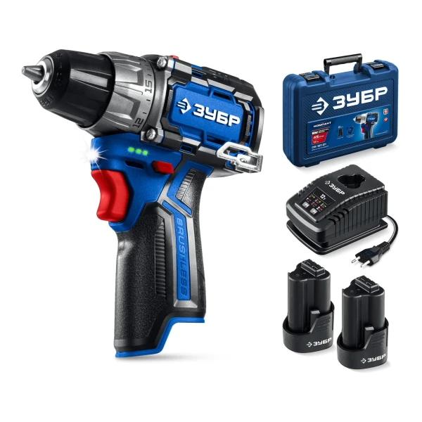 ЗУБР КОМПАКТ #3, 12 В, 45 Н·м, 2 АКБ тип Т7 (2 А·ч), дрель-шуруповерт, BRUSHLESS, кейс, Профессионал (DB-121-22)