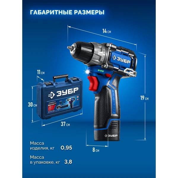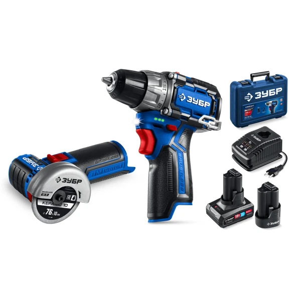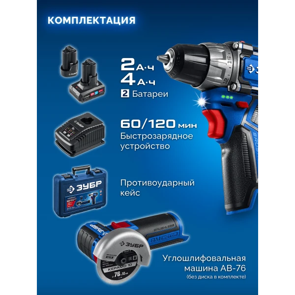 ЗУБР КОМПАКТ #5, набор: дрель-шуруповерт + мини УШМ + LED фонарь, BRUSHLESS, 12 В, 45 Н·м, 2 АКБ тип Т7 (4 и 2 А·ч), кейс, Профессионал (DB-121-42AB)