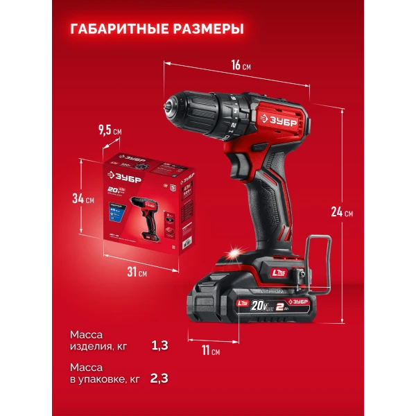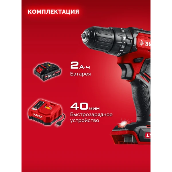 ЗУБР 20 В, 45 Н·м, 1 АКБ LMS (2 А·ч), бесщеточная ударная дрель-шуруповерт (ДБУ-45-21)