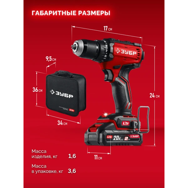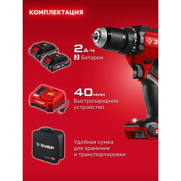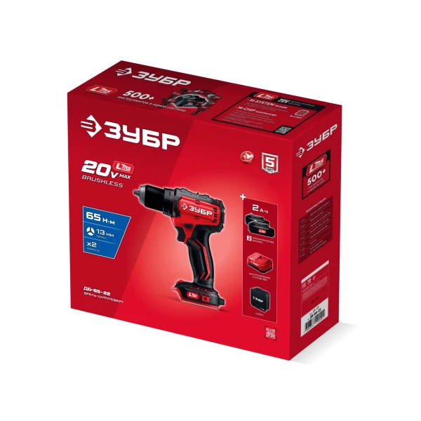 ЗУБР 20 В, 65 Н·м, 2 АКБ LMS (2 А·ч), бесщеточная дрель-шуруповерт, сумка (ДБ-65-22)