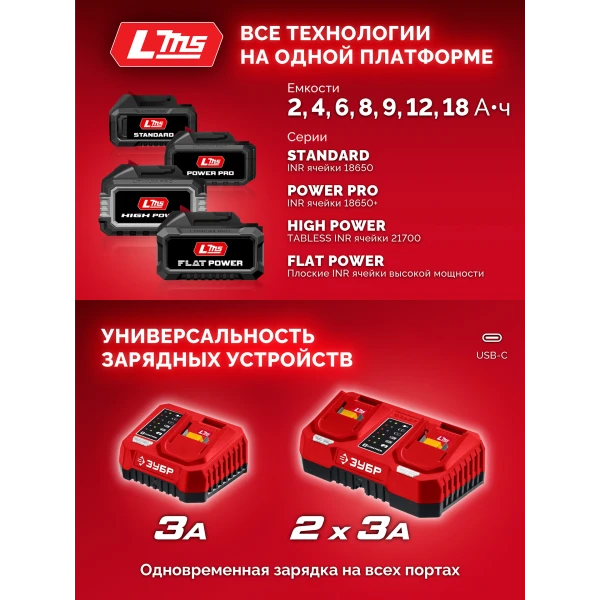 - Два аккумулятора универсальной системы LMS повышенной емкости 2.0 А*ч позволяют инструменту работать дольше и эффективнее