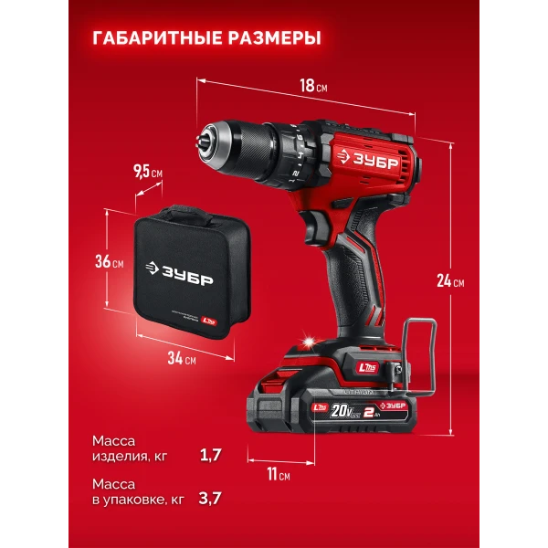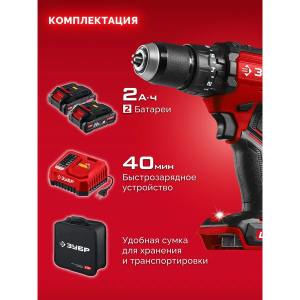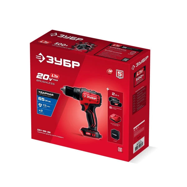 ЗУБР 20 В, 65 Н·м, 2 АКБ LMS (2 А·ч), бесщеточная ударная дрель-шуруповерт, сумка (ДБУ-65-22)