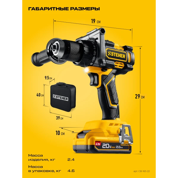 STEHER 20 В, 165 Н·м, 2 АКБ LMS (2 А·ч), бесщеточная дрель-шуруповерт, сумка (CB-165-22)