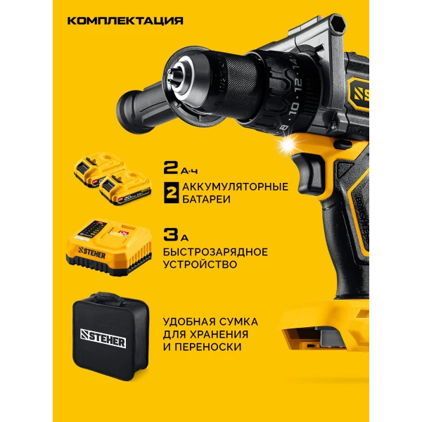 STEHER 20 В, 165 Н·м, 2 АКБ LMS (2 А·ч), бесщеточная ударная дрель-шуруповерт, сумка (CBS-165-22)