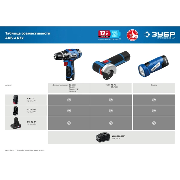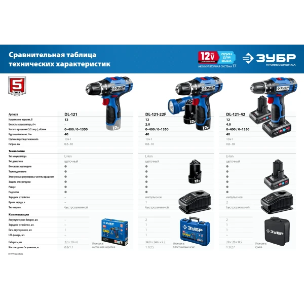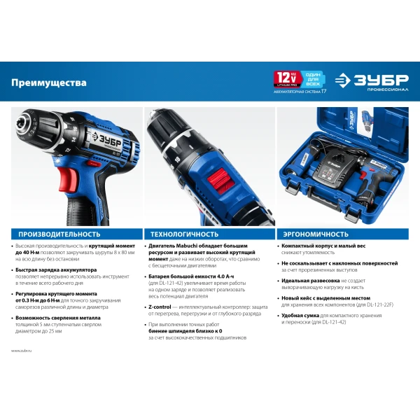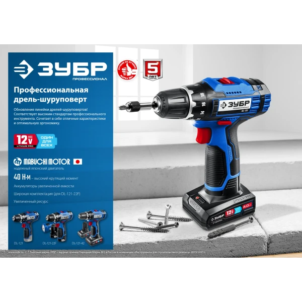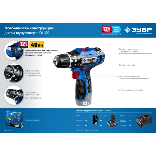 ЗУБР 12 В, 40 Н·м, без АКБ (тип Т7), дрель-шуруповерт, Профессионал (DL-121)