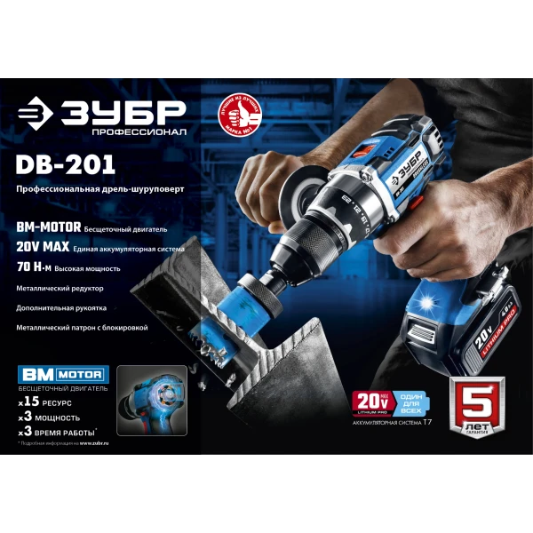 ЗУБР Т7, 20 В, 70 Н·м, без АКБ, бесщеточная дрель-шуруповерт, Профессионал (DB-201)