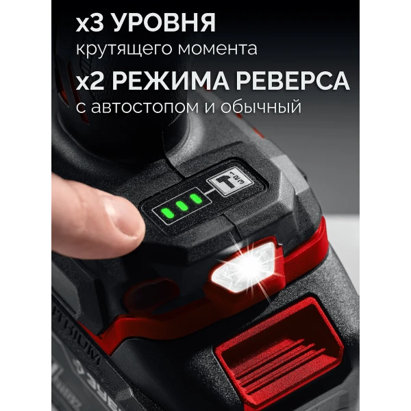 - Три уровня регулировки предоставляют возможность настроить крутящий момент под предстоящую работу или используемый крепеж
