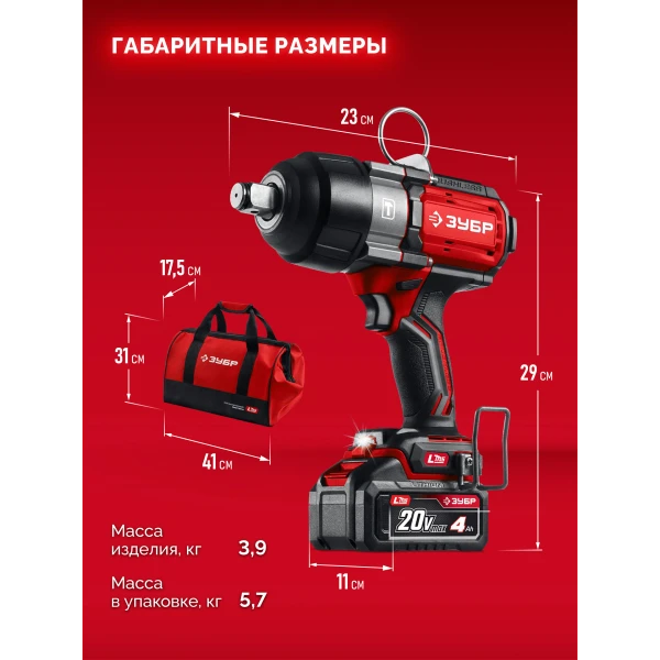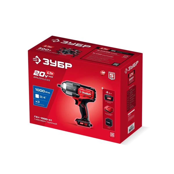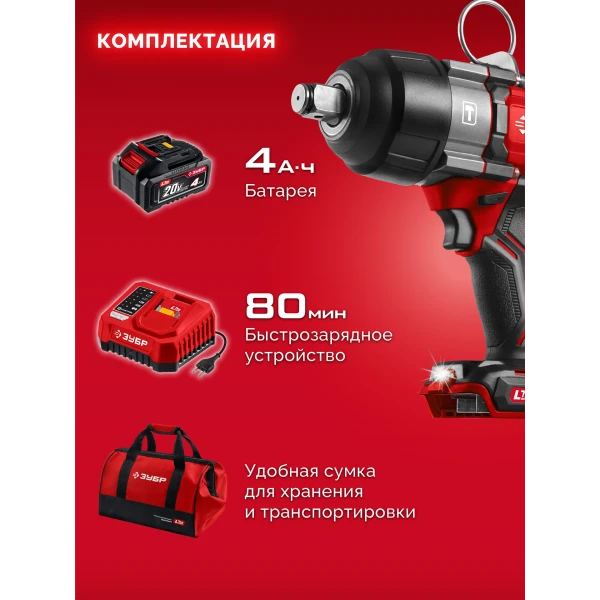 ЗУБР 20 В, 1000 Н·м, 1 АКБ LMS (4 А·ч), бесщеточный ударный гайковерт, сумка (ГБУ-1000-41)