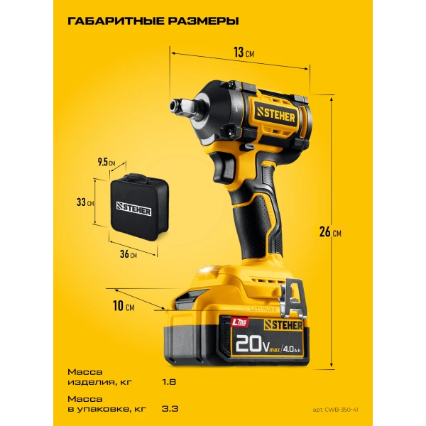 STEHER 20 В, 350 Н·м, 1 АКБ LMS (4 А·ч), бесщеточный ударный гайковерт, сумка (CWB-350-41)