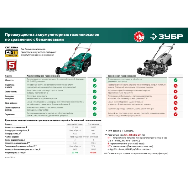 - Прекрасная альтернатива бензиновой и электрической газонокосилкам: отсутствие необходимости постоянной покупки ГСМ и контроля уровня топлива и масла, нет опасности повредить провод и проблем с ограничением его длины, простота эксплуатации и ремонта, меньшие шум и вибрация и полное отсутствие вредных выбросов