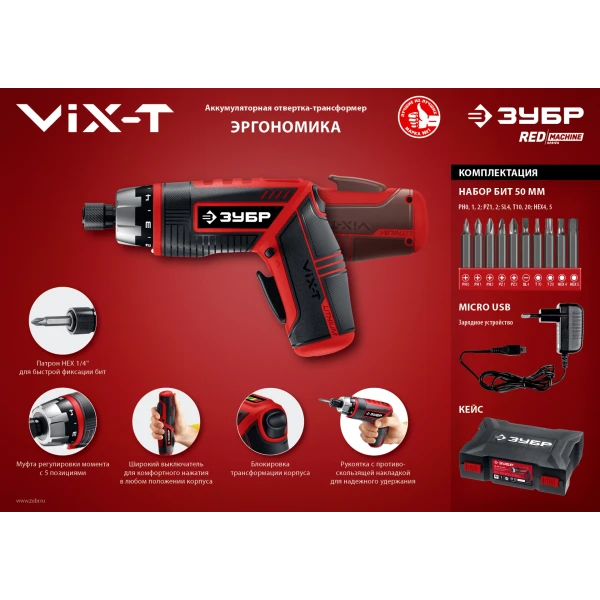 ЗУБР ViX-T 3.6 В, аккумуляторная отвертка-трансформер, кейс, 10 бит (ЗО-ЕМ-3.6 Ли)