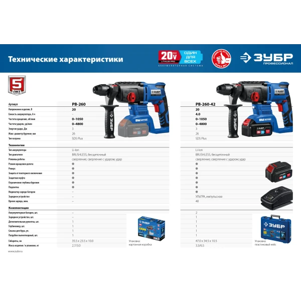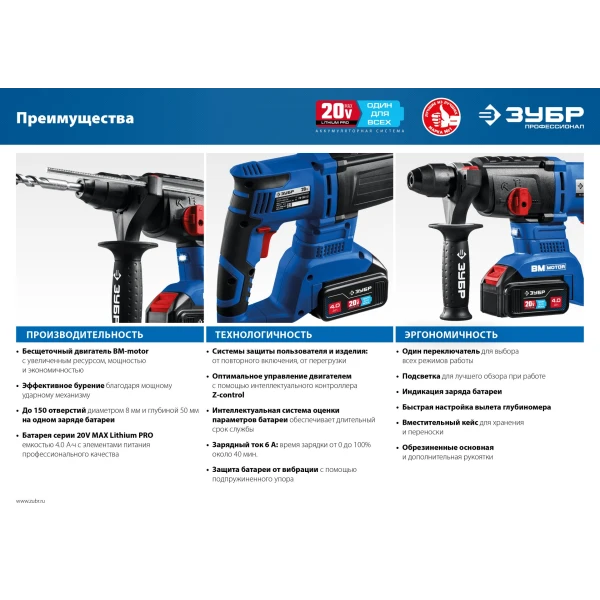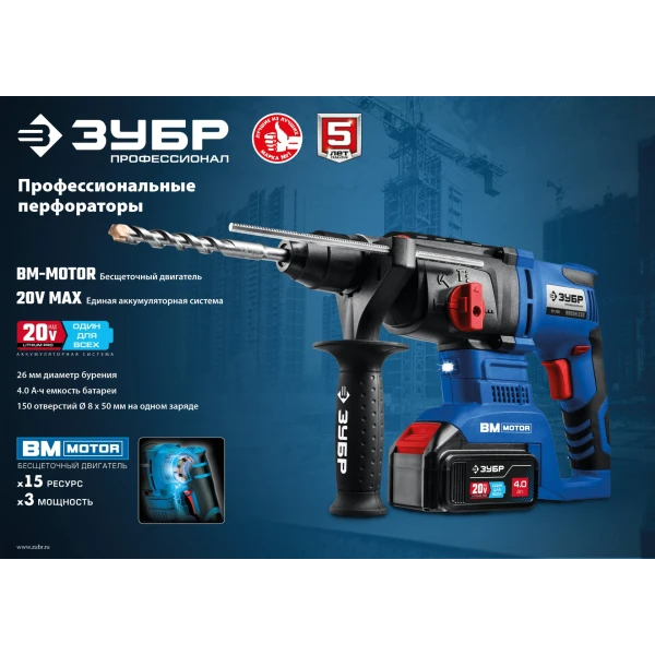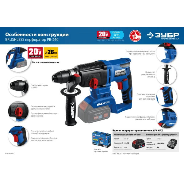 ЗУБР Т7, 20 В, 26 мм, без АКБ, бесщеточный перфоратор, Профессионал (PB-260)