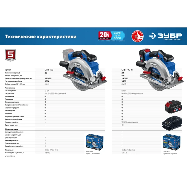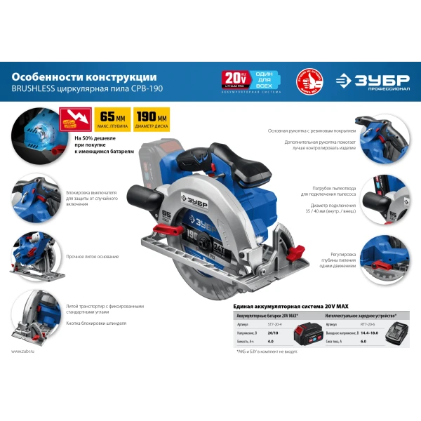 ЗУБР Т7, 20 В, d190 мм, без АКБ, бесщеточная пила циркулярная, Профессионал (CPB-190)