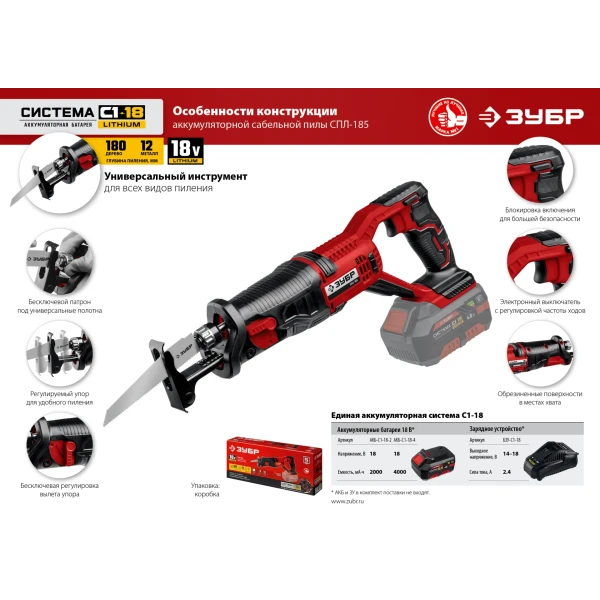 ЗУБР С1-18, 18 В, 180 мм, без АКБ, сабельная пила (СПЛ-185)