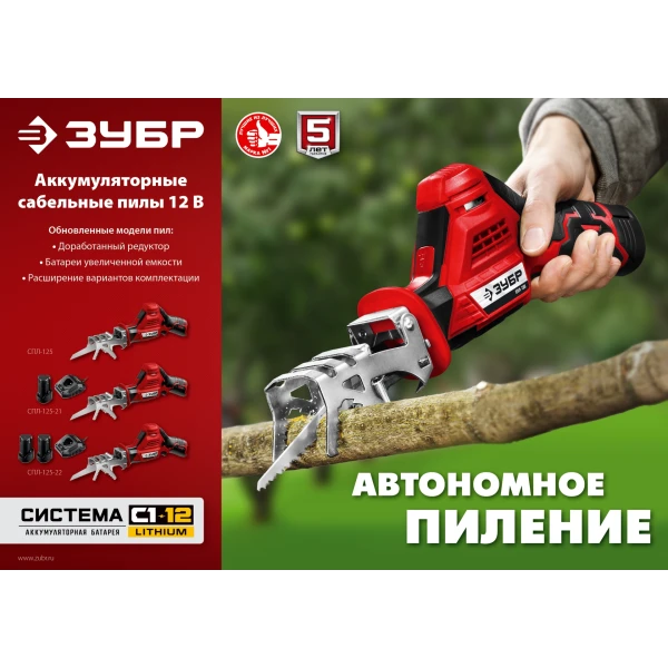 ЗУБР С1-12, 12 В, 80 мм, 2 АКБ (2 А·ч), сабельная пила (СПЛ-125-22)