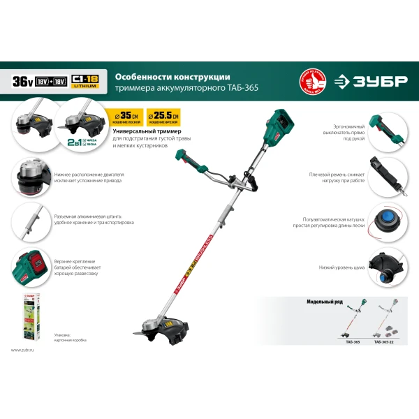 ЗУБР С1-18, 36 В, 35/25.5 см, без АКБ, бесщеточный триммер (ТАБ-365)