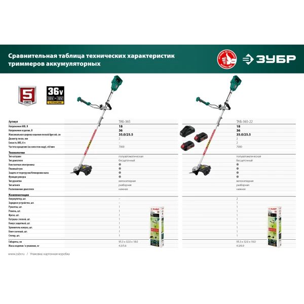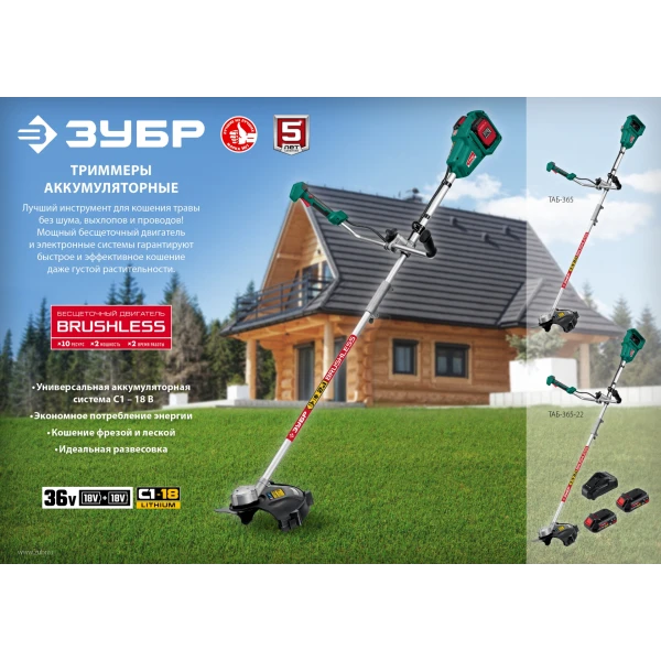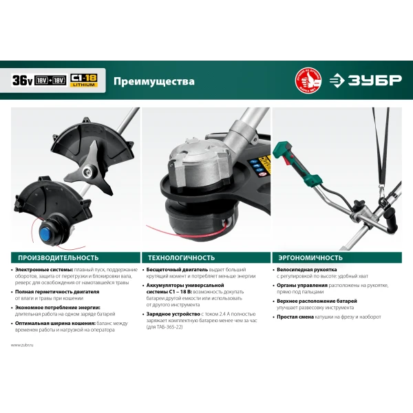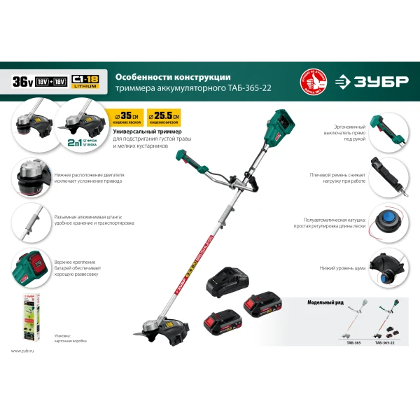 ЗУБР С1-18, 36 В, 35/25.5 см, 2х18 В АКБ (2 А·ч), бесщеточный триммер (ТАБ-365-22)