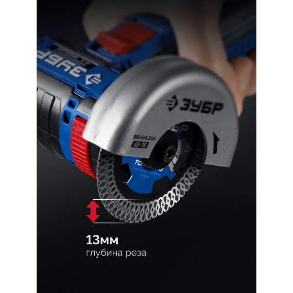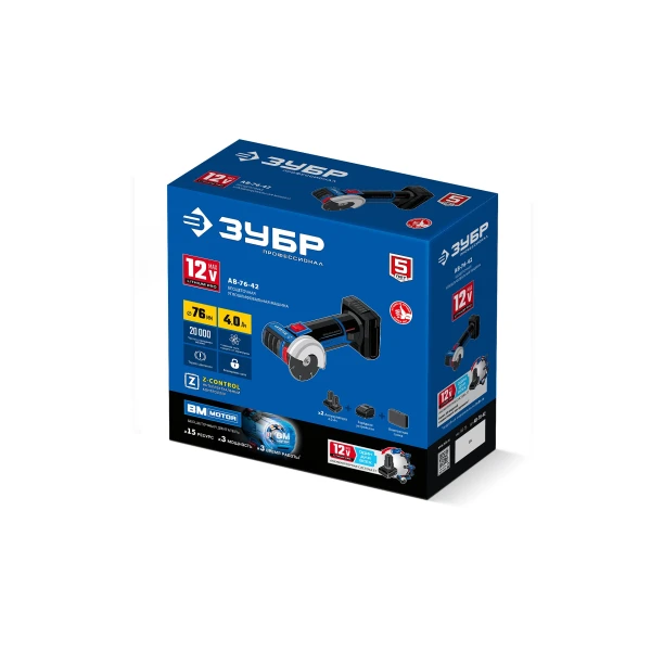 ЗУБР 12 В, D76 мм, 2 АКБ тип Т7 (4 А·ч), бесщеточная УШМ, сумка, Профессионал (AB-76-42)