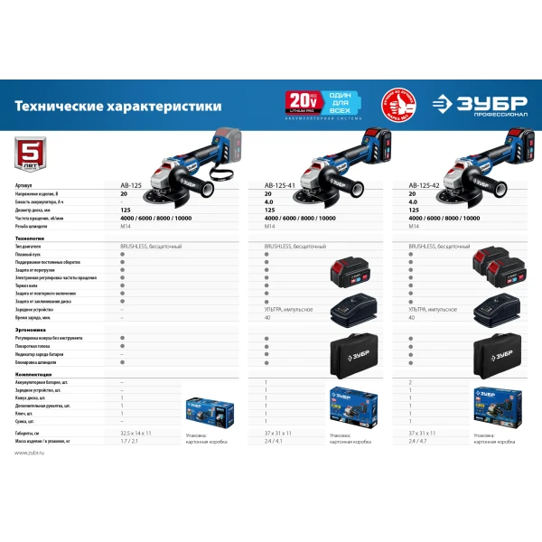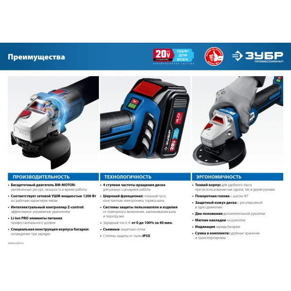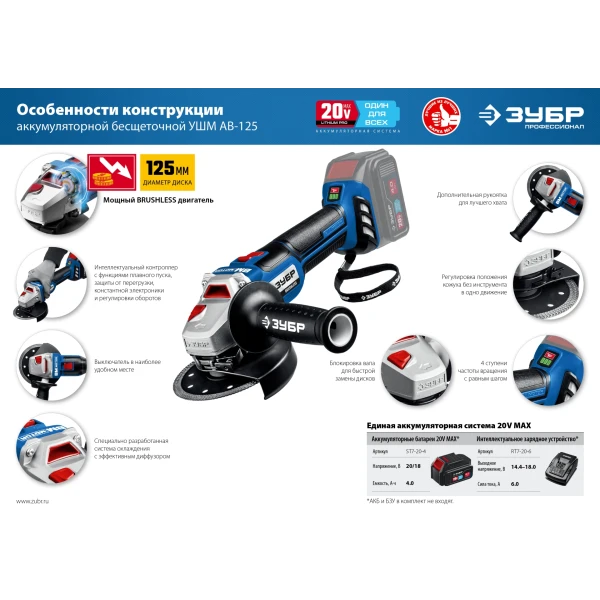 ЗУБР Т7, 20 В, 125 мм, без АКБ, бесщеточная УШМ, Профессионал (AB-125)