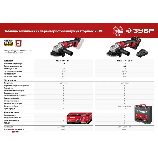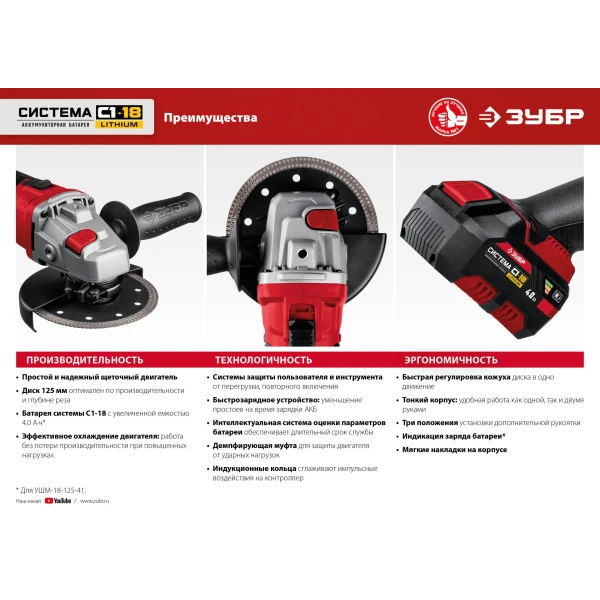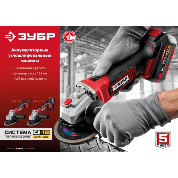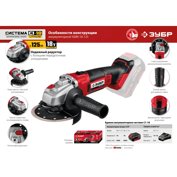 ЗУБР С1-18, 18 В, 125 мм, без АКБ, УШМ (УШМ-18-125)