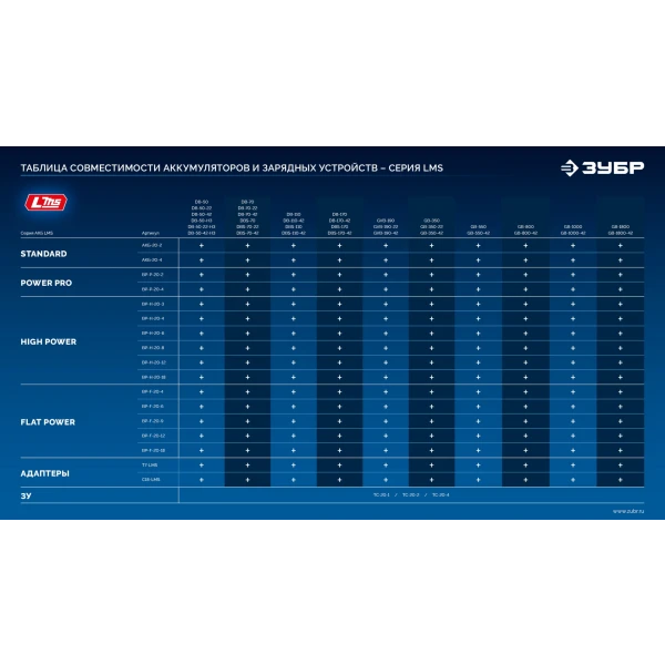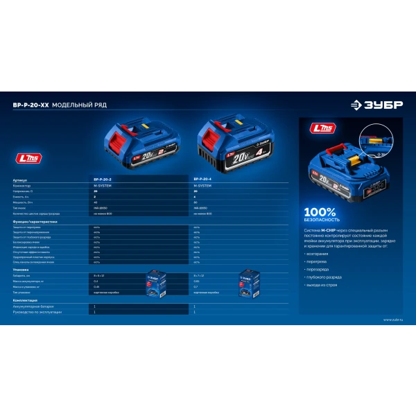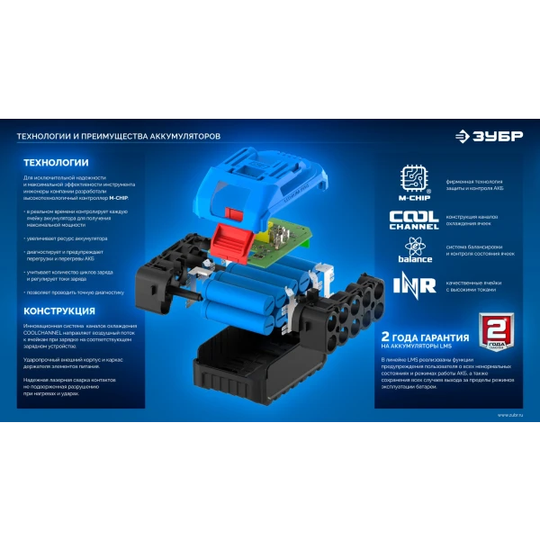 Источник питания для инструмента ЗУБР Професссионал системы LMS позволит Вам работать дольше и производительнее. Качественные элементы INR-18650 с усовершенствованной технологией обеспечивают повышенные удельные характеристики и длительный срок службы