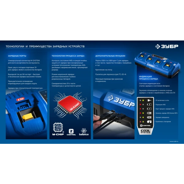 - Система М-CHIP через специальный разъем постоянно контролирует состояние каждой ячейки аккумулятора при эксплуатации, зарядке и хранении для гарантированной защиты от:
