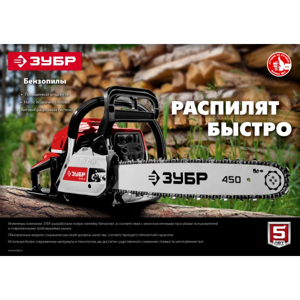 Идеальный вариант для пиления досок, бруса, стволов различных пород дерева на дачном участке. В отличие от электрической, бензиновая пила оснащена более мощным двигателем, безопасна в отношении поражения электрическим током, может работать в любую погоду и в любом месте. Функции легкого запуска, автоматической смазки цепи и эффективная антивибрационная защита делают пилу легкой в обращении и комфортной в работе. Двойной тормоз цепи, приводимый в действие при откидывании защитного щитка или при отпускании клавиши блокировки на рукоятке, а также встроенный цепеуловитель и металлический упор делают пилу безопасной в применении. Большая удельная мощность, высокое качество применяемых материалов и изготовления, обеспечивающие увеличенный ресурс, делают бензиновую пилу ЗУБР Вашим лучшим помощником. Обратите внимание, что рекомендуемая пильная гарнитура ЗУБР устанавливается только комплектом