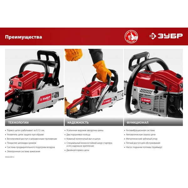 Идеальный вариант для пиления досок, бруса, стволов различных пород дерева на дачном участке. В отличие от электрической, бензиновая пила оснащена более мощным двигателем, безопасна в отношении поражения электрическим током, может работать в любую погоду и в любом месте. Функции легкого запуска, автоматической смазки цепи и эффективная антивибрационная защита делают пилу легкой в обращении и комфортной в работе. Двойной тормоз цепи, приводимый в действие при откидывании защитного щитка или при отпускании клавиши блокировки на рукоятке, а также встроенный цепеуловитель и металлический упор делают пилу безопасной в применении. Большая удельная мощность, высокое качество применяемых материалов и изготовления, обеспечивающие увеличенный ресурс, делают бензиновую пилу ЗУБР Вашим лучшим помощником. Обратите внимание, что рекомендуемая пильная гарнитура ЗУБР устанавливается только комплектом