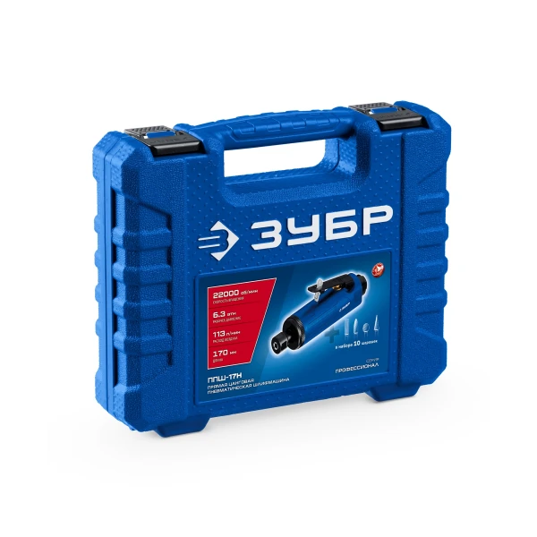 ЗУБР набор в кейсе: прямая цанговая пневмошлифмашина, 10 шарошек и оснастка, ПРОФЕССИОНАЛ (64333-H)