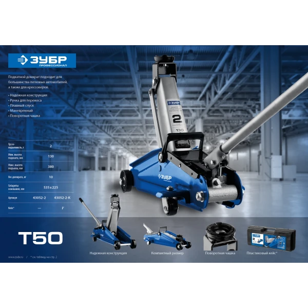 ЗУБР Т-50, 2 т, 130 - 380 мм, подкатной домкрат с увеличенным подъемом в кейсе, Профессионал (43052-2-K)