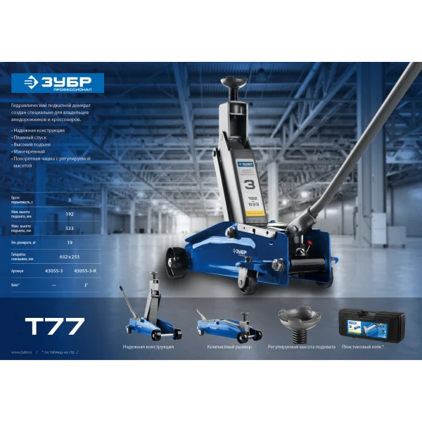 ЗУБР Т-77, 3 т, 192 - 533 мм, подкатной домкрат с высоким подъемом в кейсе, Профессионал (43055-3-K)