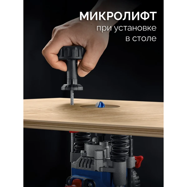 - Функция микролифта с комплектной рукояткой позволяет регулировать вылет фрезы при установке ″в стол″