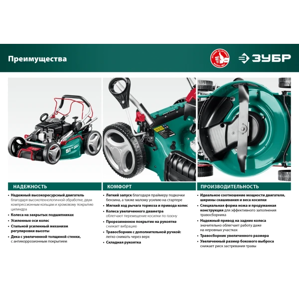 - Сбалансированные характеристики мощности двигателя и ширины кошения ускоряют процесс обработки и снижают нагрузку, чем увеличивают ресурс изделия