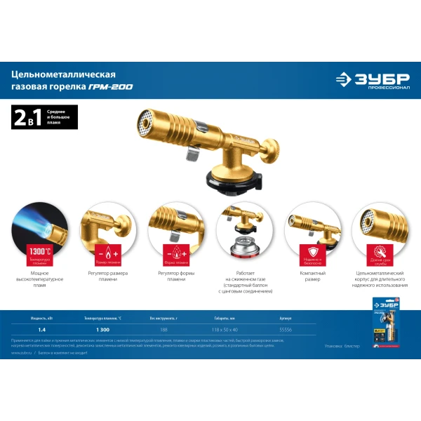 ЗУБР ГРМ-200, 1300°C, цельнометаллическая, 2 в 1, газовая горелка на баллон с цанговым соединением, Профессионал (55556)
