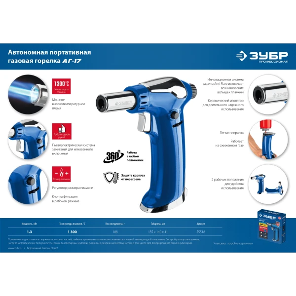 ЗУБР АГ-17, 1300°C, автономная газовая горелка с пьезоподжигом, Профессионал (55518)