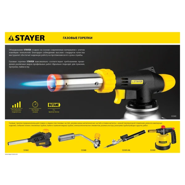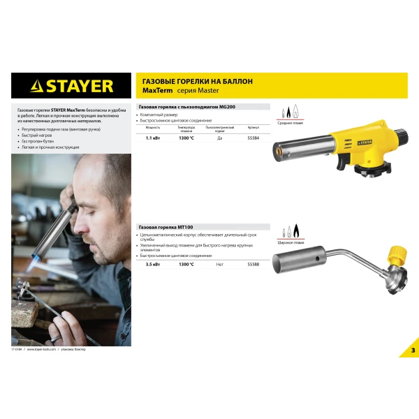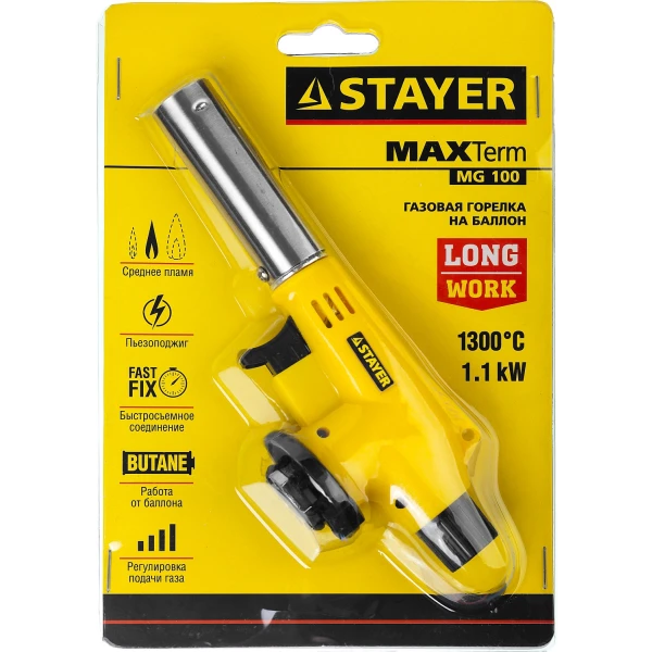 STAYER MaxTerm MG 100, 1300°C, газовая горелка с пьезоподжигом на баллон с цанговым соединением (55584)