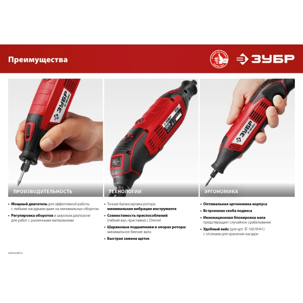 Гравер ЗУБР - универсальное устройство для широкого спектра работ (резка, сверление, полирование, гравирование, шлифование). Расширенная комплектация включает в себя базовый набор насадок для начала работы сразу после покупки. Мощный двигатель позволяет эффективно работать даже при большой нагрузке. ЗУБР - реализуя Ваши мечты