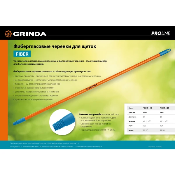 GRINDA FIBER-120, фибергласовый, коническая резьба, длина 1170 мм, черенок для щеток, PROLine (39137)
