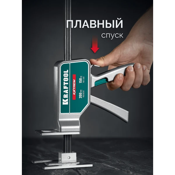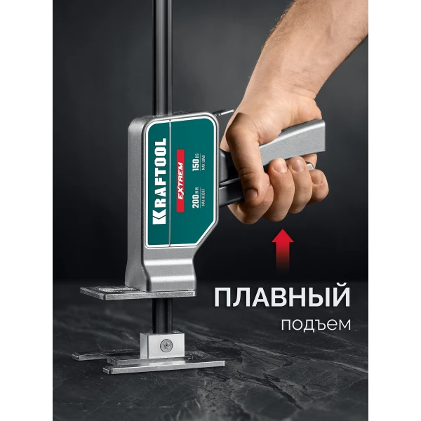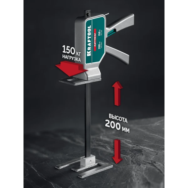 Универсальный подъемник KRAFTOOL EXTREM надежный помощник при проведении монтажных работ тяжелых и крупногабаритных предметов, таких как: крупноформатная плитка, кухонные гарнитуры и шкафы, двери и различные панели. Подъемник может поднять груз до 150 кг на высоту до 200 мм.
