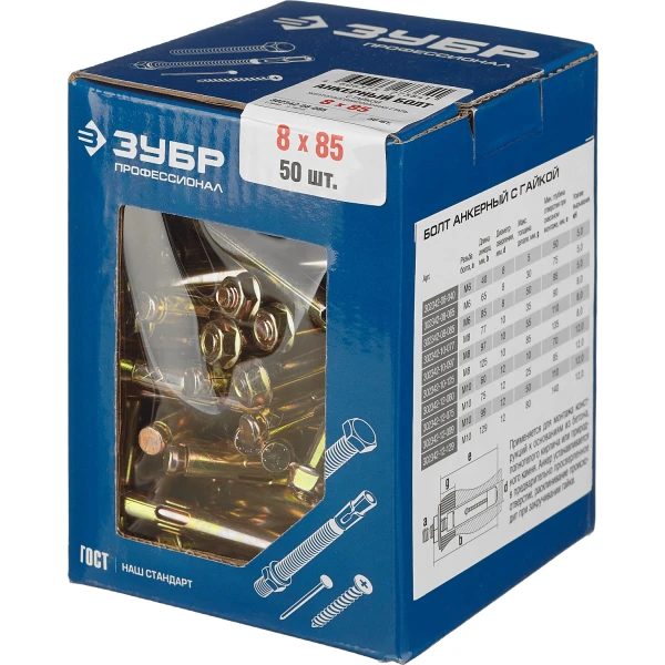 ЗУБР М8 х 85 мм, 50 шт, анкерный болт с гайкой, Профессионал (302342-08-085)