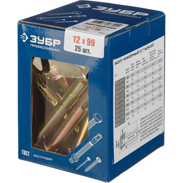 ЗУБР М12 х 99 мм, 25 шт, анкерный болт с гайкой, Профессионал (302342-12-099)
