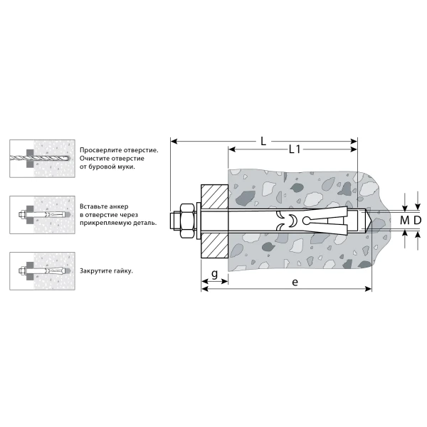 Для монтажа конструкций к полнотелым основаниям: поверхностям из бетона, полнотелого кирпича или природного камня. Анкер устанавливается в предварительно просверленное и очищенное от буровой муки отверстие и расклинивается при закручивании гайки