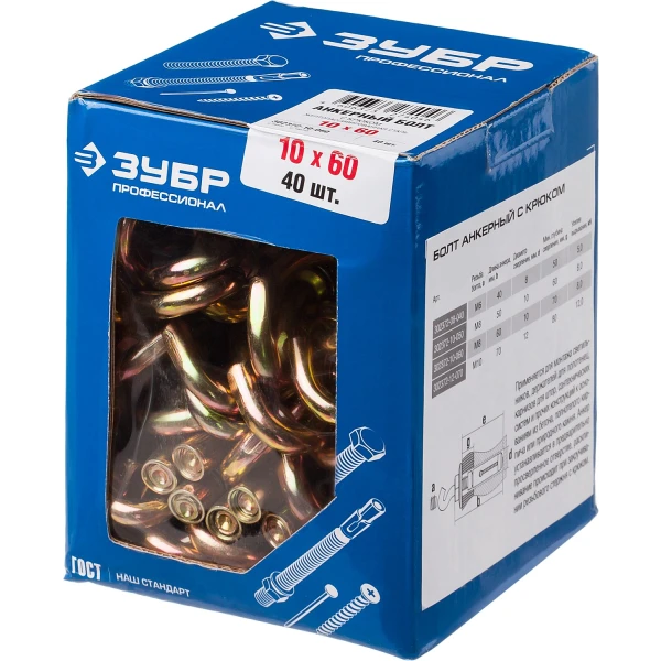 ЗУБР М10 х 60 мм, 40 шт, анкерный болт с крюком, Профессионал (302372-10-060)