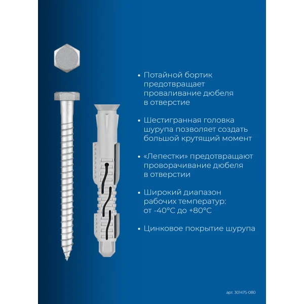 - Специально разработанные ″лепестки″ предотвращают проворачивание установленного дюбеля в отверстии.