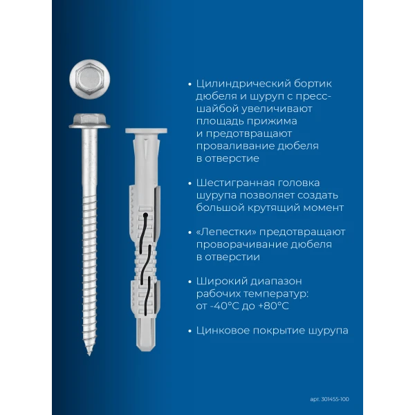 - Цилиндрический бортик дюбеля и шуруп с пресс-шайбой увеличивают площадь прижима фиксируемой детали, а также предотвращают проваливание дюбеля в отверстие.