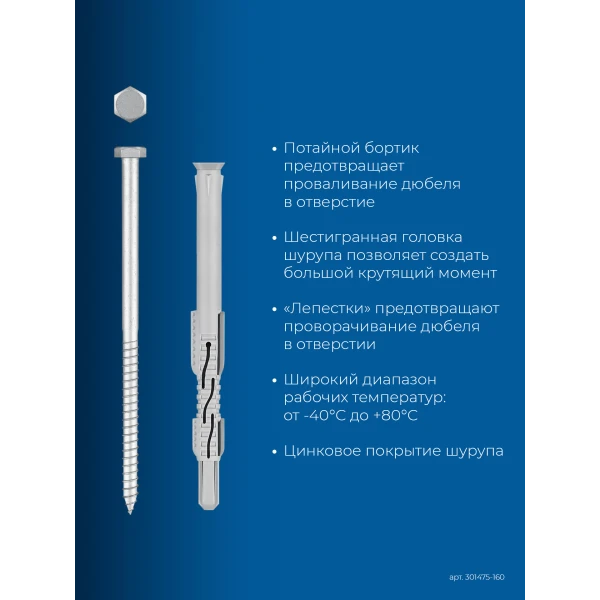 - Шестигранная головка шурупа позволяет создать большой крутящий момент при монтаже, обеспечивая дополнительную прочность соединения.