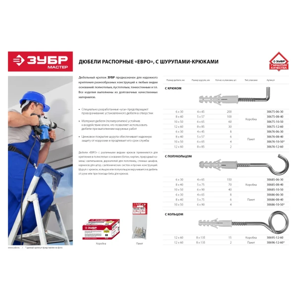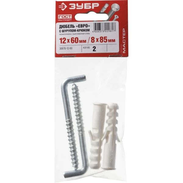 ЗУБР ЕВРО, 12 х 60 / 8 х 85 мм, 2 шт, распорный дюбель с шурупом-крюком (30676-12-60)