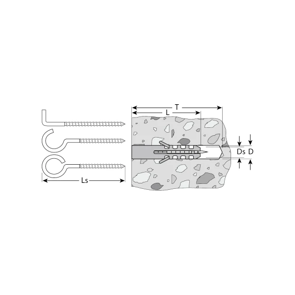 Для крепления в полнотелые основания (бетон, кирпич, природный камень) светильников, держателей для полотенец, стенных шкафов, карнизов для штор, сантехнических систем и прочих конструкций. Дюбель устанавливается в предварительно просверленное отверстие. Диаметр предварительного сверления: 12 мм. Крюк вкручивается в дюбель от руки или при помощи биты для крюков.