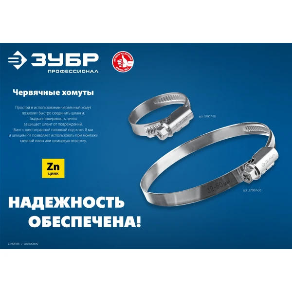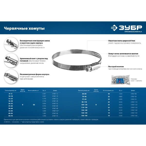 Червячный хомут состоит из штампованной ленты и винта с червячной резьбой. Накатная лента имеет гладкую внутреннюю поверхность, которая защищает шланг от повреждений. При вращении винта лента сжимается, благодаря чему создается надежное и герметичное соединение шлангов, различных труб, и т.д. Червячный винт снабжен шестигранной головкой под ключ 8 мм и шлицем PH, что позволяет использовать при монтаже гаечный ключ или шлицевую отвертку.